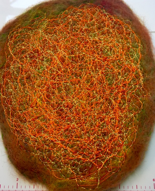 It still wasn't reading orange enough for me, so I began again, this time felting on a piece of orange felt. It wasn't working enough, so I added the orange thread and free-motion stitched with gold.